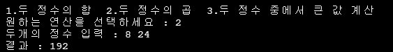 printf("1.두 정수의 합\t2.두 정수의 곱\t3.두 정수 중에서 큰 값 계산\n");