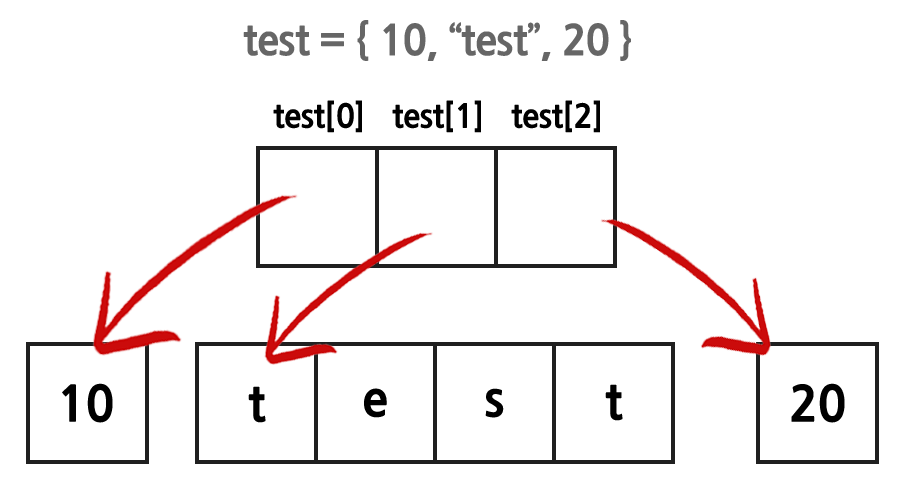 ✔ 배열의 요소가 주소 값을 의미하기 때문에 배열에 서로 다른 형태의 데이터를 저장할 수 있다.