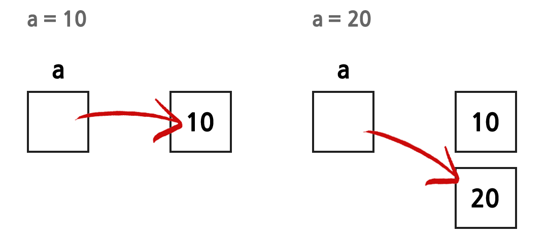 ✔ a에 10을 할당했다가 20으로 재할당하면 a가 참조하는 주소 값이 바뀌었다고 볼 수 있다.