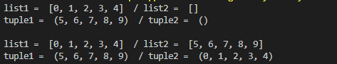 ✔ (튜플) 요소의 추가, 변경, 삭제는 불가능하지만, 다른 시퀀스에 값을 복사하거나 결합할 수는 있다.