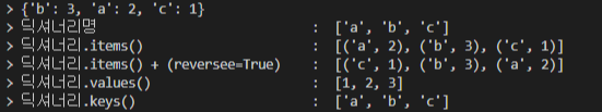 print('> 딕셔너리.items() + (reversee=True)\t: ',sorted_items)