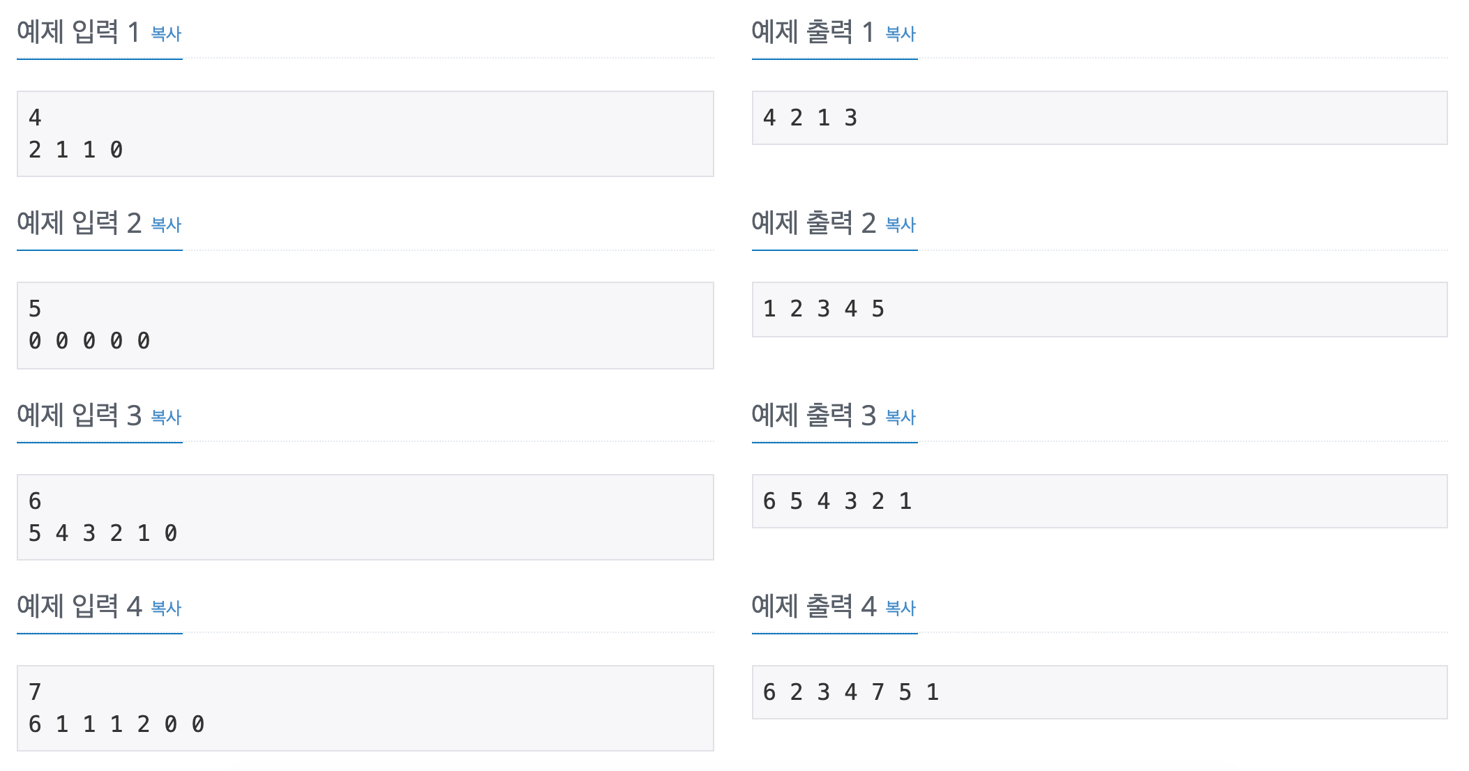 첫째 줄에 사람의 수 N이 주어진다. N은 10보다 작거나 같은 자연수이다. 둘째 줄에는 키가 1인 사람부터 차례대로 자기보다 키가 큰 사람이 왼쪽에 몇 명이 있었는지 주어진다. i번째 수는 0보다 크거나 같고, N-i보다 작거나 같다. i는 0부터 시작한다.