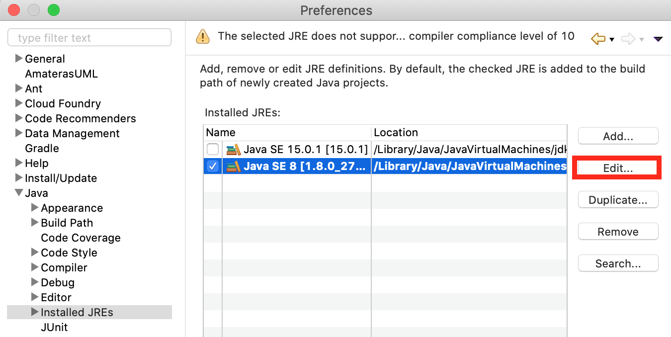 08) Preference → Java → Installed JREs → 주로 사용하는 버전 선택 후, Edit 를 선택한다