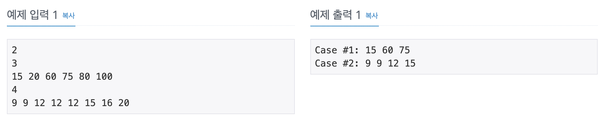 개별 테스트 케이스에 대해서 출력라인은 “Case #x: y” 형식(큰 따옴표는 제외)으로 출력하며, x는 1부터 시작하는 테스트 케이스의 번호 (인덱스)이며, y는 할인가격에 해당하는 오름차순으로 정렬된 N개의 정수들이다.