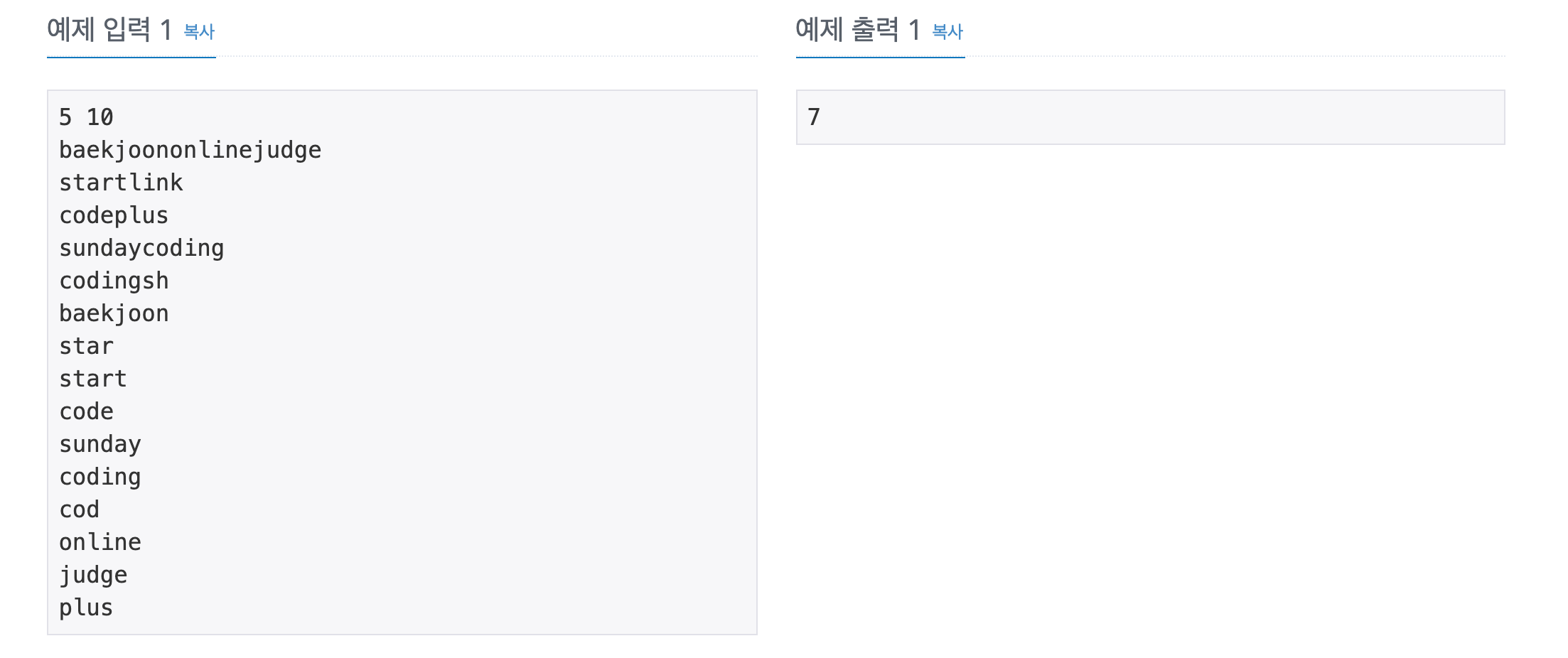 문자열 S의 접두사란 S의 가장 앞에서부터 부분 문자열을 의미한다. 예를 들어, S = "codeplus"의 접두사는 "code", "co", "codepl", "codeplus"가 있고, "plus", "s", "cude", "crud"는 접두사가 아니다.