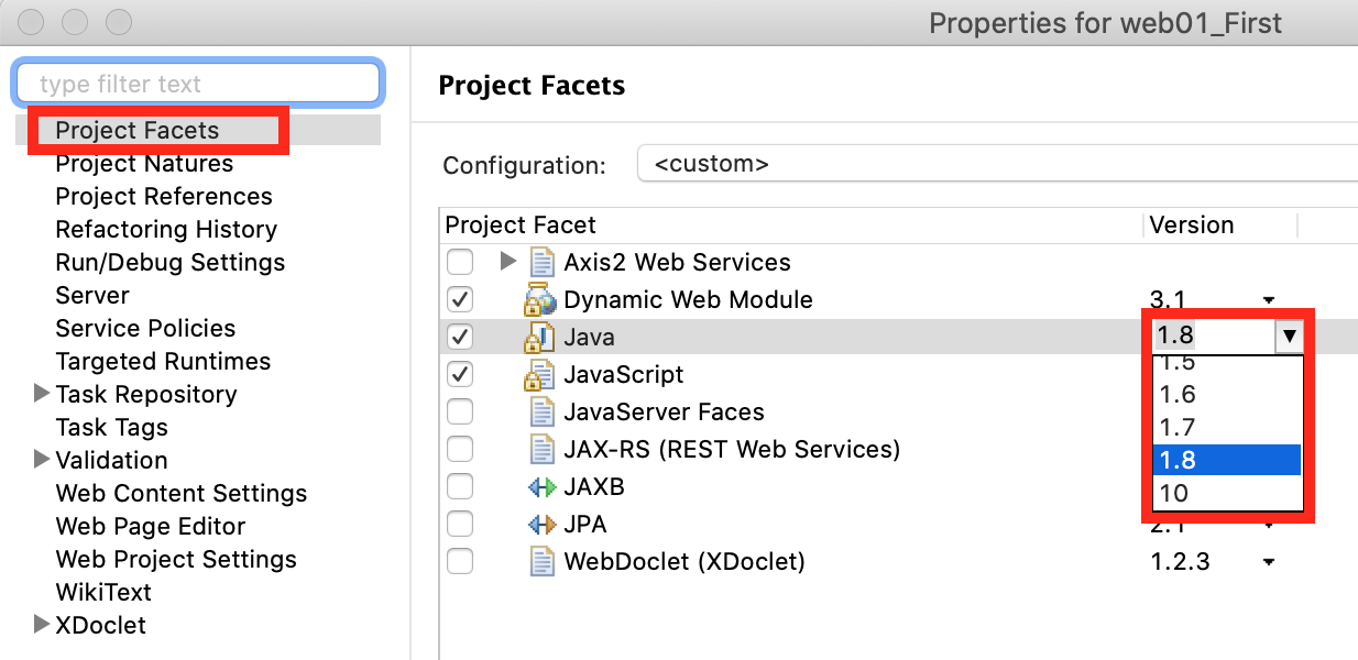2. Project Facets로 들어가, 원하는 jdk버전을 선택한다. 끝!