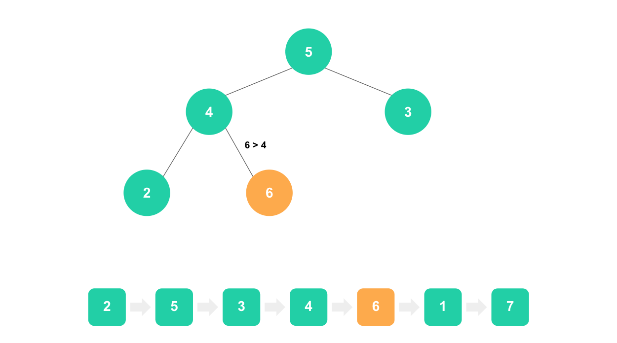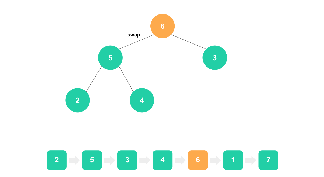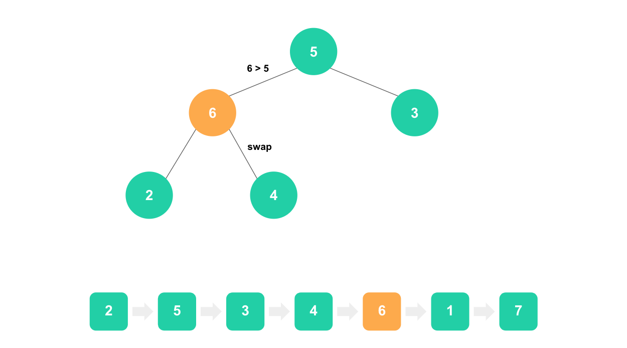 swap을 진행한 후 확인해보면 부모 노드(5)보다 자식 노드(6)가 크기때문에 다시 한번 swap을 진행한다