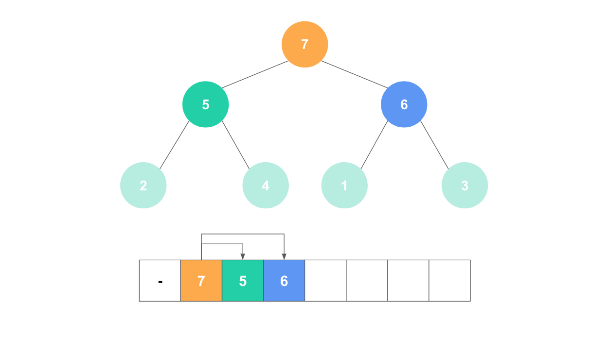 루트 노드의 값(7)은 배열[1]에 넣고 왼쪽 자식 노드 값(5)은 배열[2], 오른쪽 자식 노드 값(6)은 배열[3]에 넣어준다