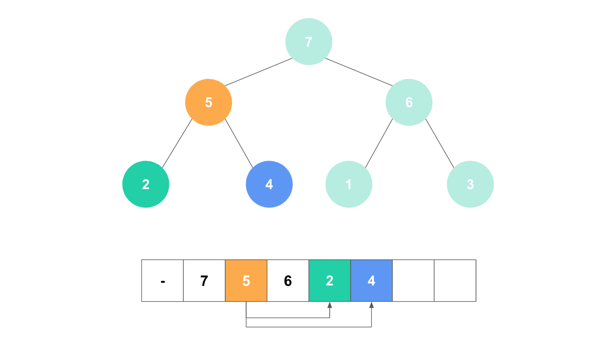 그다음 배열[2]의 왼쪽 자식 노드의 값(2)은 배열[4], 오른쪽 자식 노드의 값(4)은 배열[5]에 넣는다