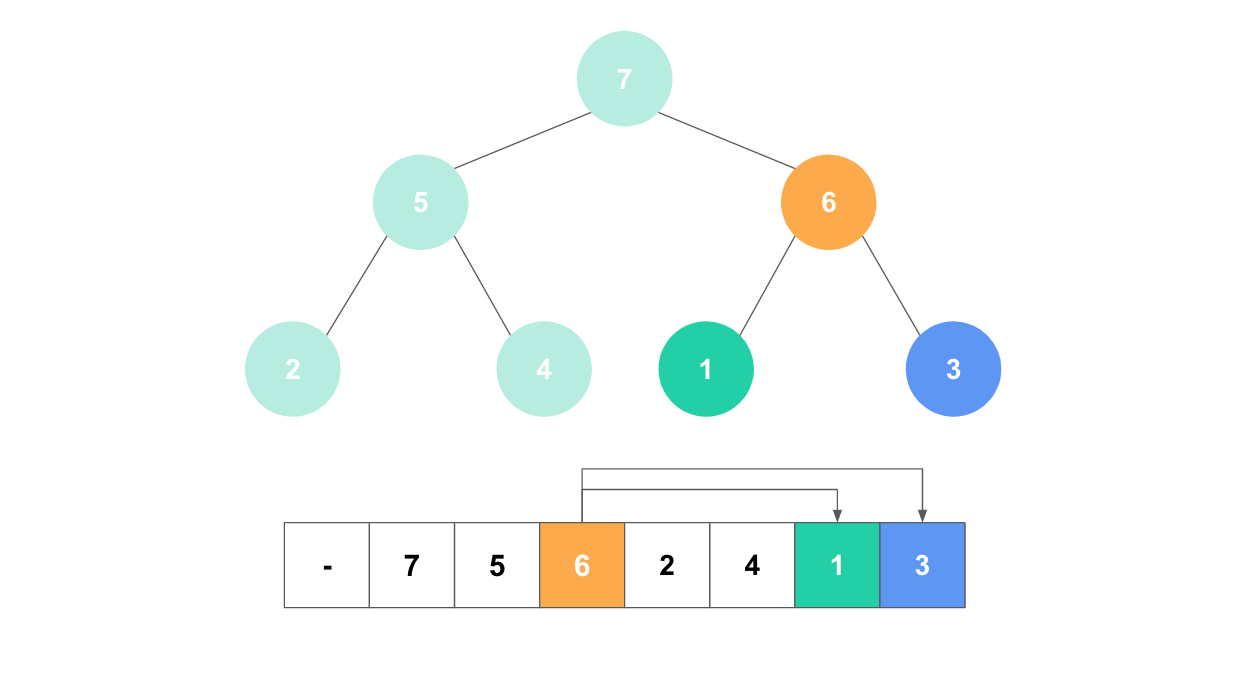 배열[3]의 왼쪽 자식 노드의 값(1)은 배열[6], 오른쪽 자식 노드의 값(3)은 배열[7]에 넣는다