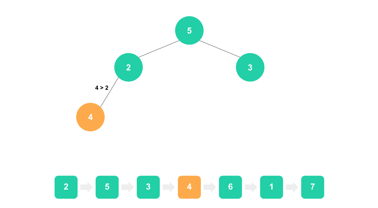 4을 삽입한다. 부모 노드(2) 보다 자식 노드(4)가 크기 때문에, swap을 진행한다