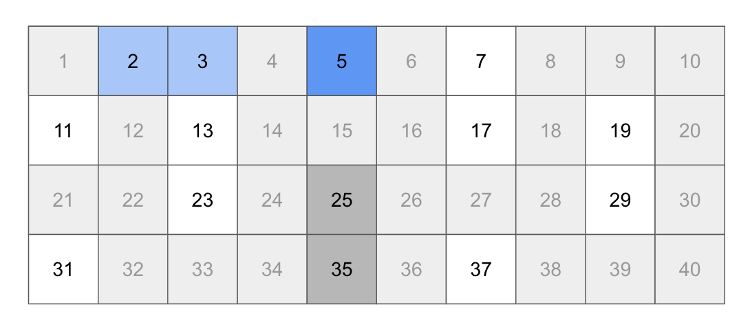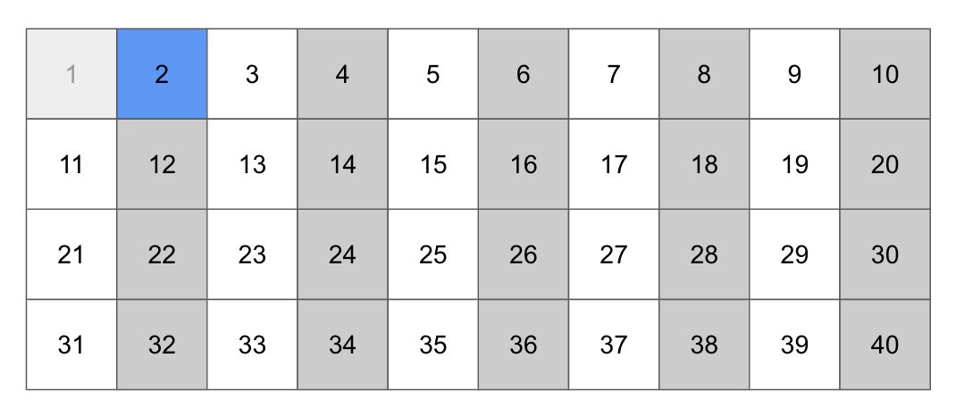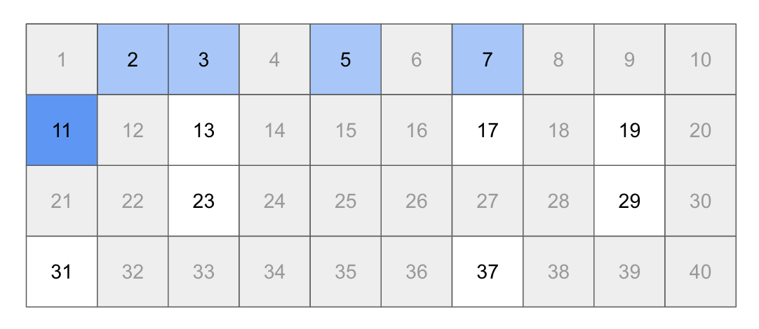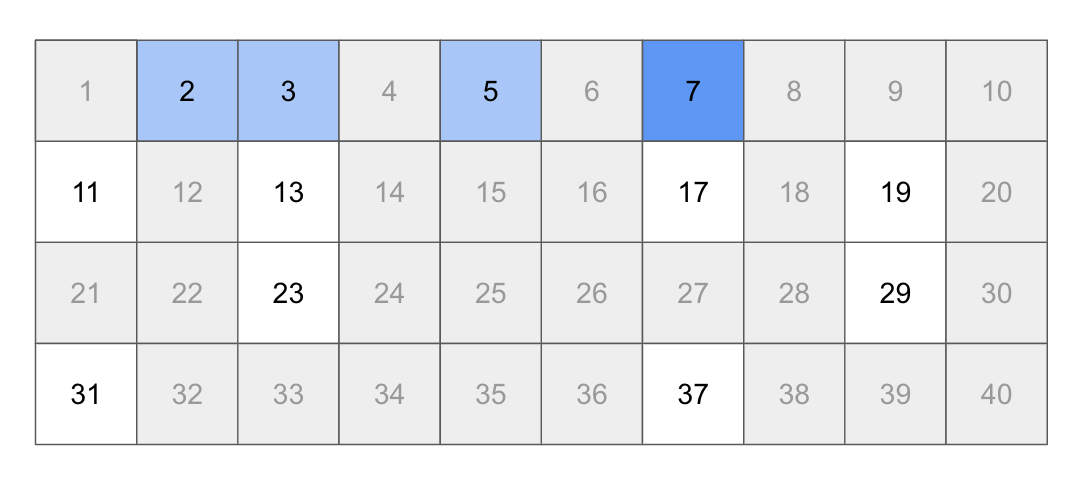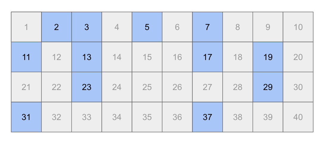 1부터 40까지의 수 중 소수를 구해보며 에라토스테네스의 체 방법에 대해 알아보자