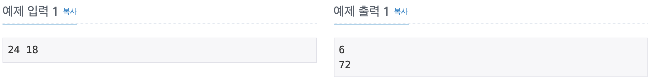 첫째 줄에는 입력으로 주어진 두 수의 최대공약수를, 둘째 줄에는 입력으로 주어진 두 수의 최소 공배수를 출력한다.