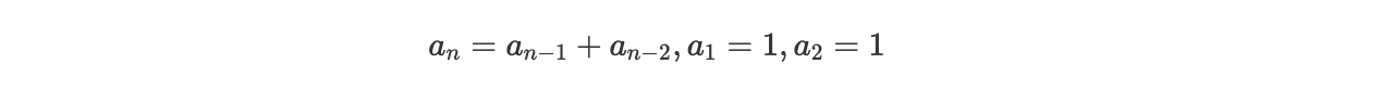 - 피보나치수열에서의 첫 번째 항과 두 번째 항이 모두 1이므로, 최종적으로 피보나치수열은 아래와 같이 정의할 수 있다