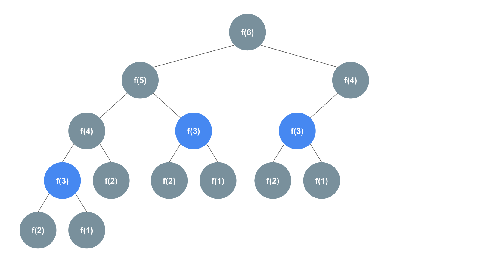 - 메모이제이션 기법을 사용하면 f(6)를 다시 표시하면 위와 같이 색칠된 노드만 방문하게 된다