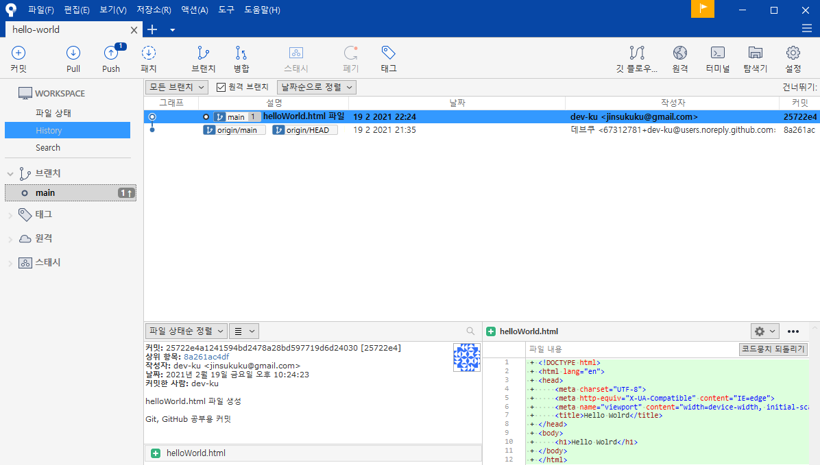 5. 왼쪽 브랜치 하단의 main을 누르면 아래와 같은 정보를 확인할 수 있다.