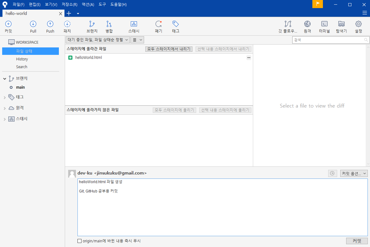 3. 원하는 파일을 선택해 스테이지에 올리기 → 말하자면 스테이지는 커밋(Commit) 예정 목록