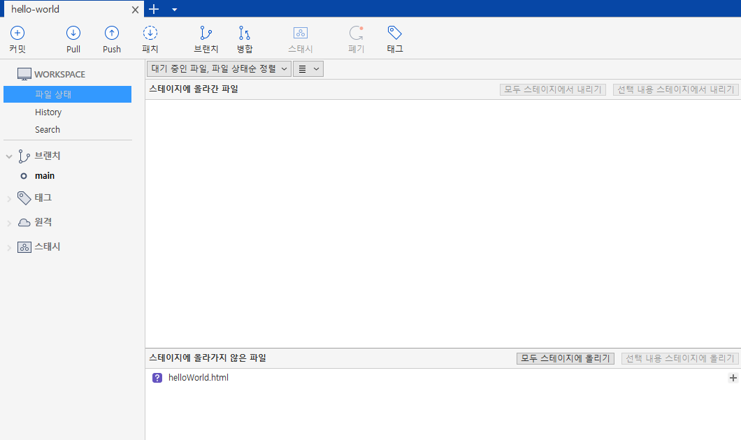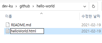 1. 클론한 디렉토리로 이동, text 파일을 하나 생성해 helloWolrd.html 파일로 저장.