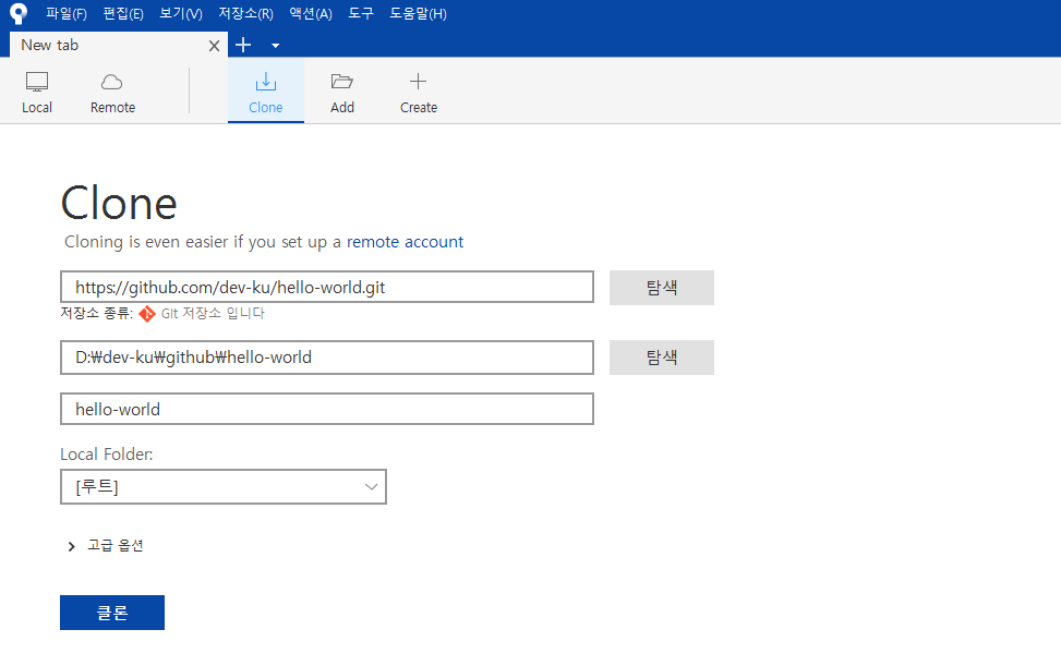 2. 목적지 경로 : 클론파일을 저장하고자 하는 디렉토리 입력