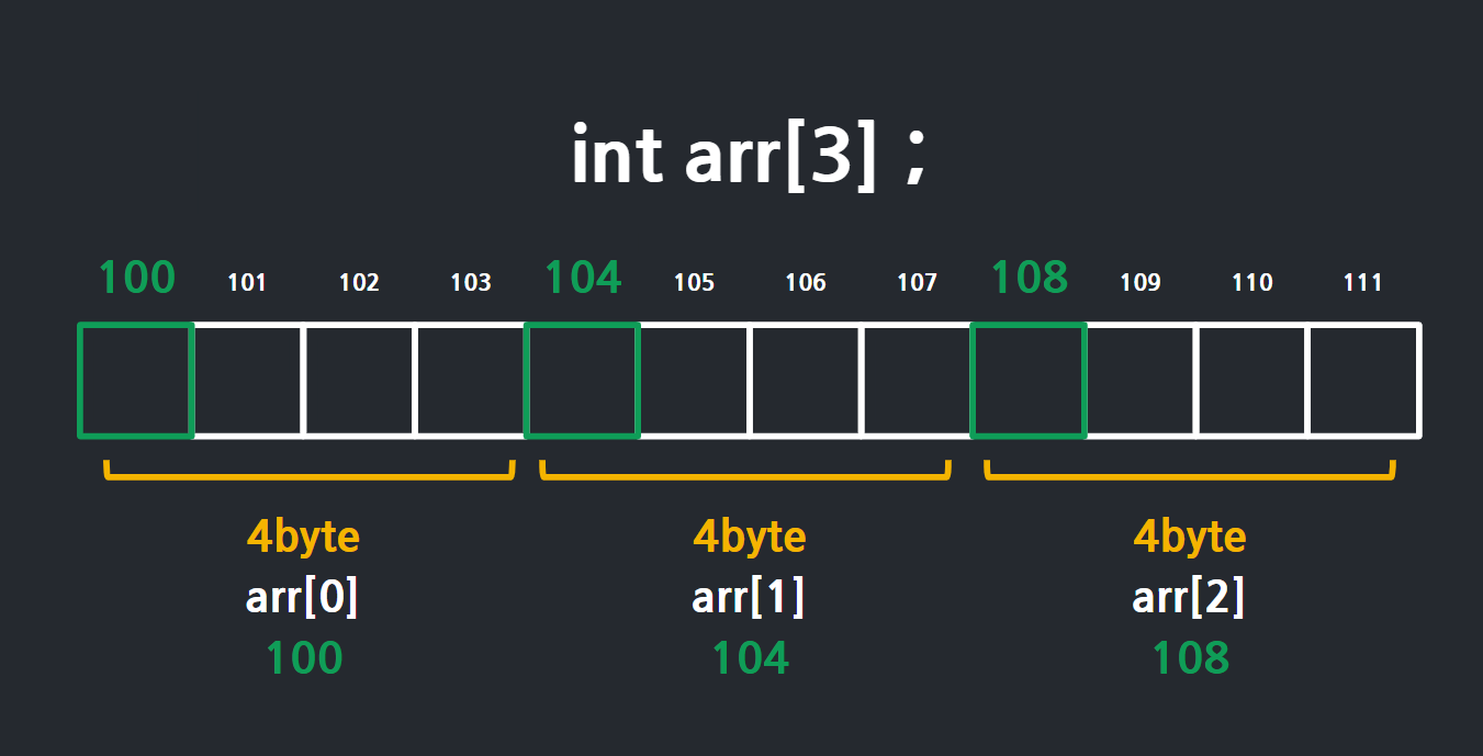 ✔ 배열의 주소를 100이라고 가정했을 때, 100 + ( 1 * 4byte ) 가 된다. 즉 arr[1]의 주소인 104가 된다.