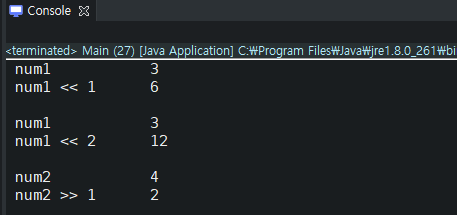 ✔ 10진수 기준으로 비트 연산자 << 는 2배, 비트 연산자 >> 는 1/2배의 연산 수행