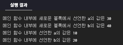 printf("메인 함수 내부에 새로운 블록에서 선언한 b의 값은 %d\n", b);