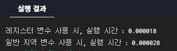 ✔ 실행할 때마다 조금씩 달라지기는 했지만, 결과적으로 레지스터 변수가 더 빠르다는 것을 확인할 수 있었다.