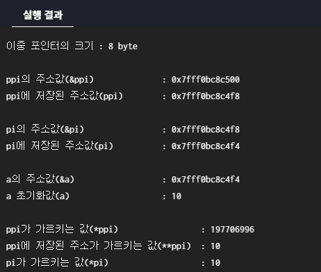 1. 이중 포인터를 변수명으로 사용하면 그 안의 값, 즉 저장된 주소값을 의미한다.